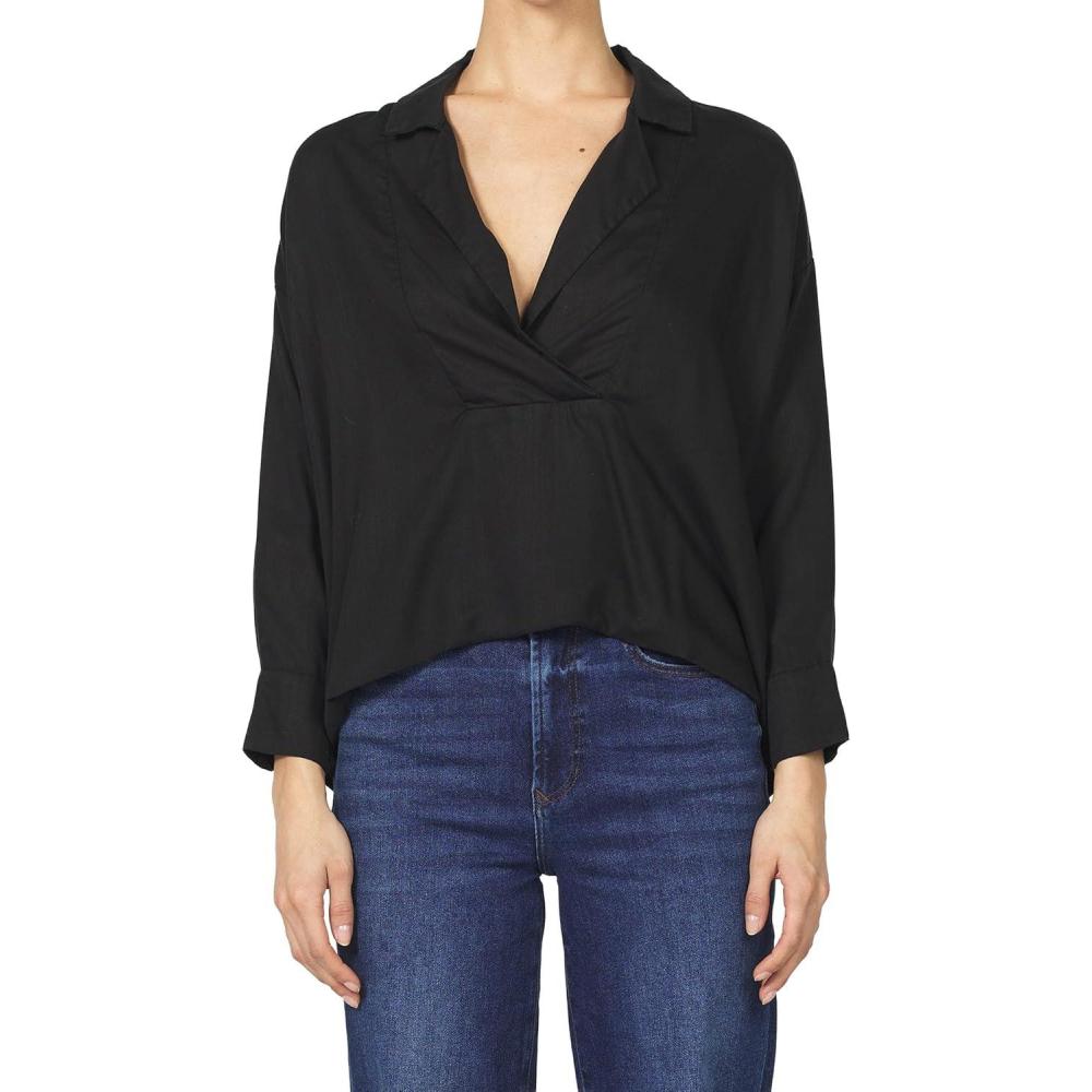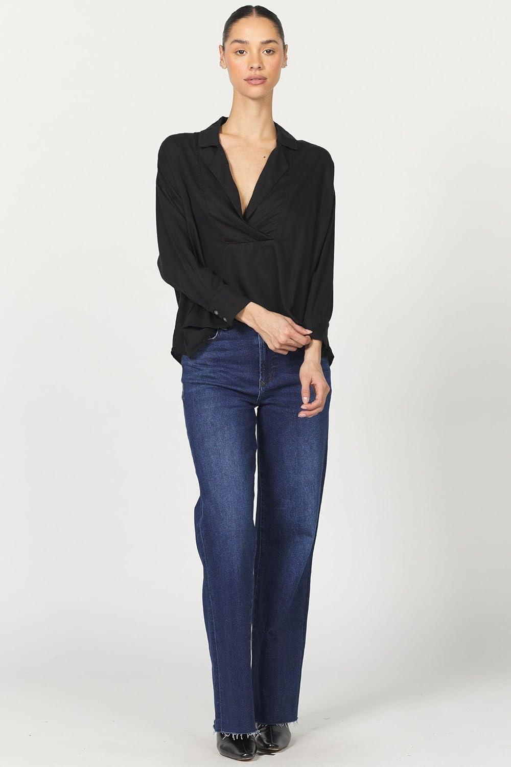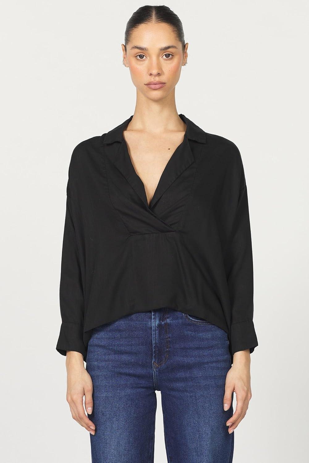 The DEAR JOHN Adelle Top in Black is crafted from 100% Tencel, offering a soft, fluid drape that makes it as comfortable as it is polished. Designed with a collared neckline, V-front, and long sleeves, this versatile popover top blends timeless design with modern wearability. Its relaxed silhouette provides an easy, effortless fit that works across settings, from casual moments to professional polish. The black shade adds understated elegance, ensuring this top becomes a staple for every wardrobe.