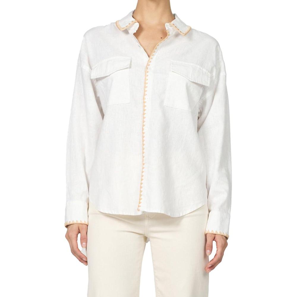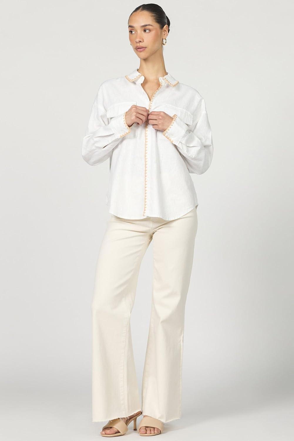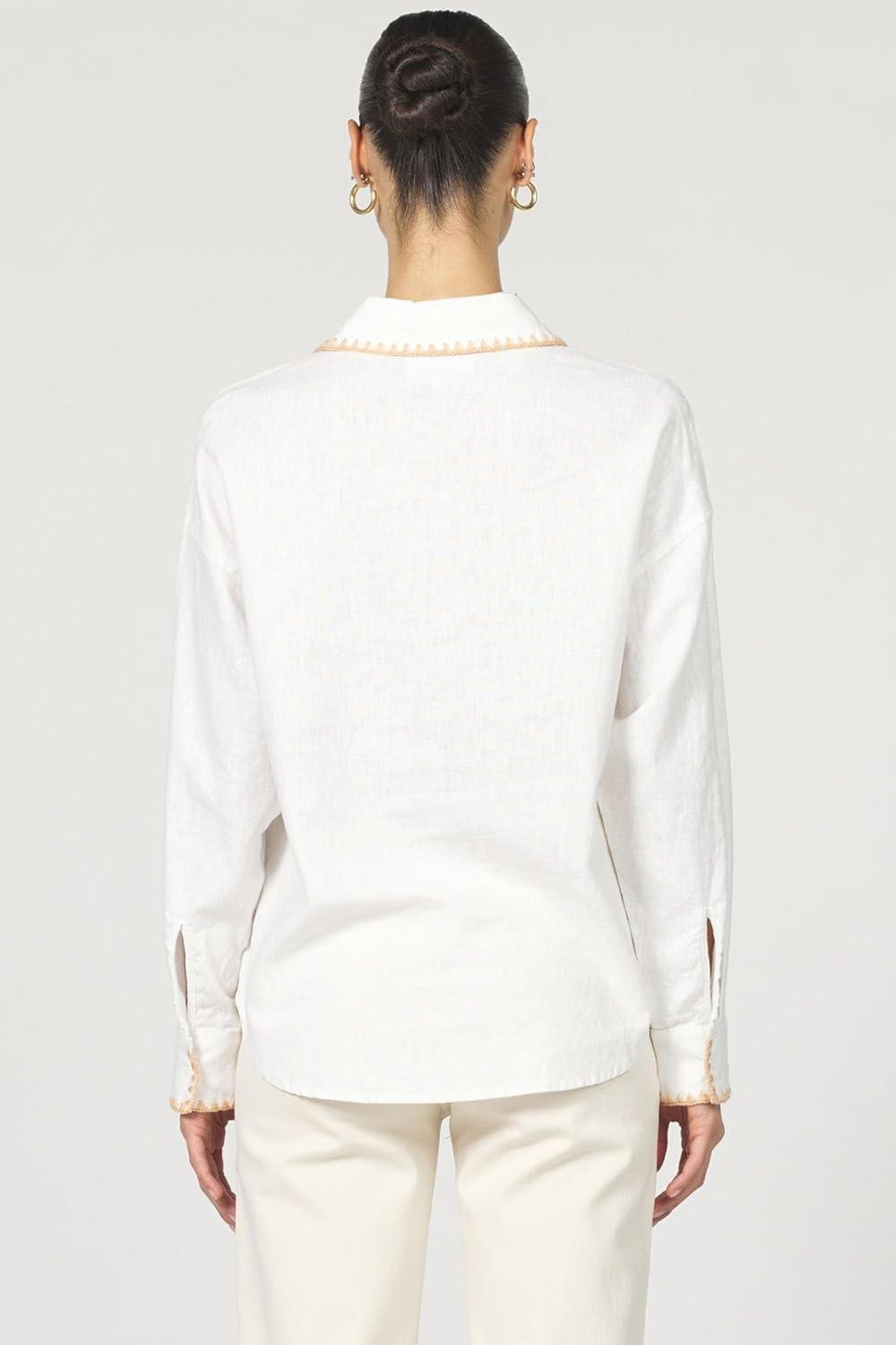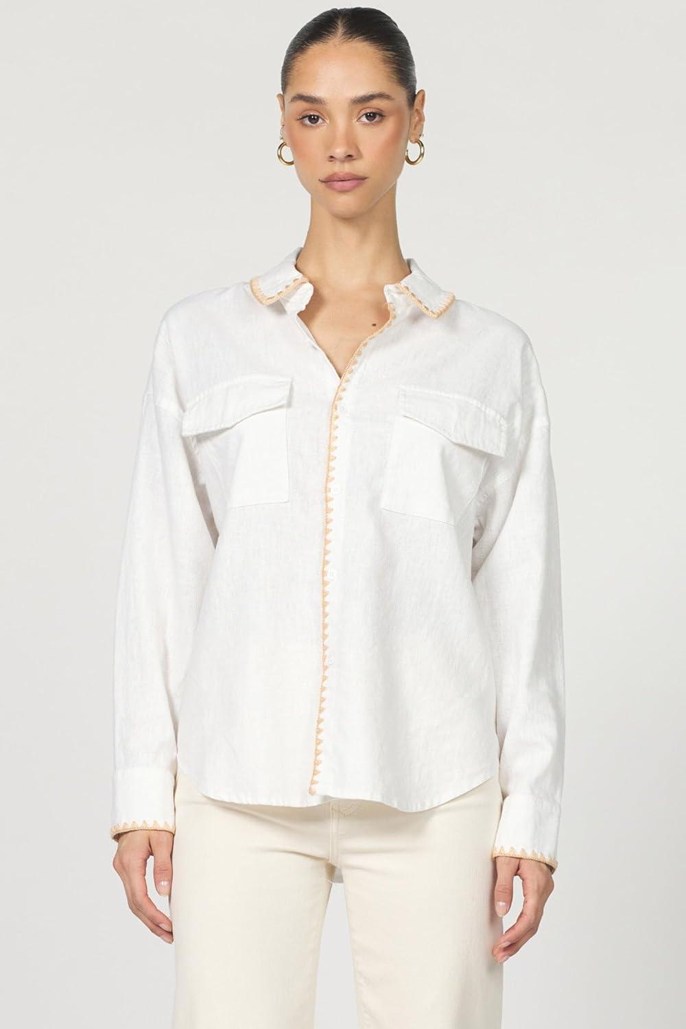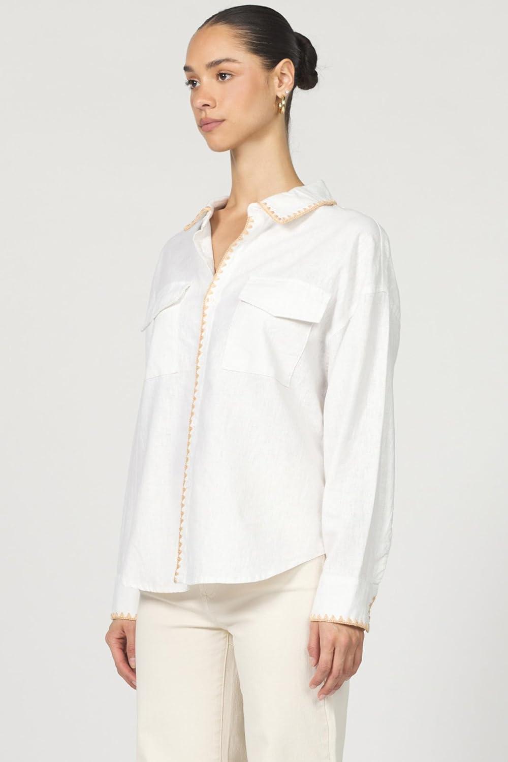 DEAR JOHN Adrianna Satin Stripe Shirt Women’s Oversized Button Down Long Sleeve Relaxed Fit Blouse(White Blanketstitch)