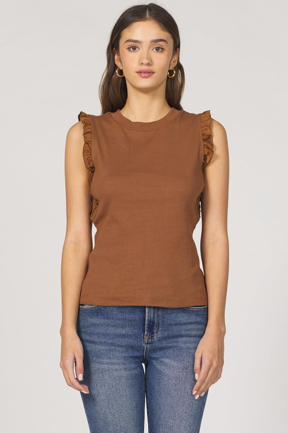 Get the DEAR JOHN Bridgette Top Sleeveless Ruffle Detail Slim Fit Crew Neck Polished Casual Blouse Soft Stretch Knit(Cappuccino) you’ve been eyeing at a discounted price during our seasonal sale event.