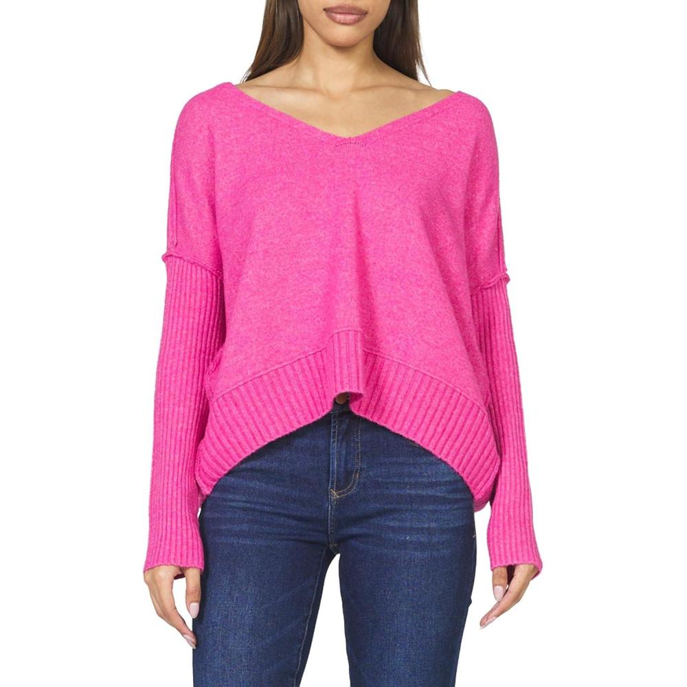 DEAR JOHN Clarette Sweater Women’s Oversized V-Neck Fine Gauge Knit Long Sleeve Pullover(Hot Pink)