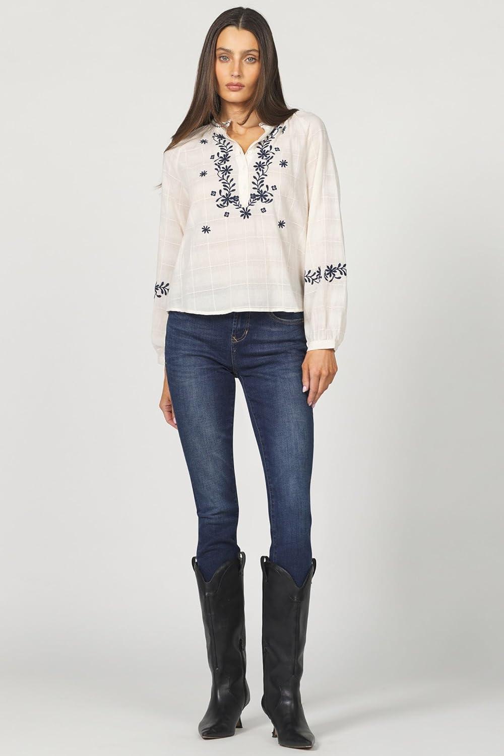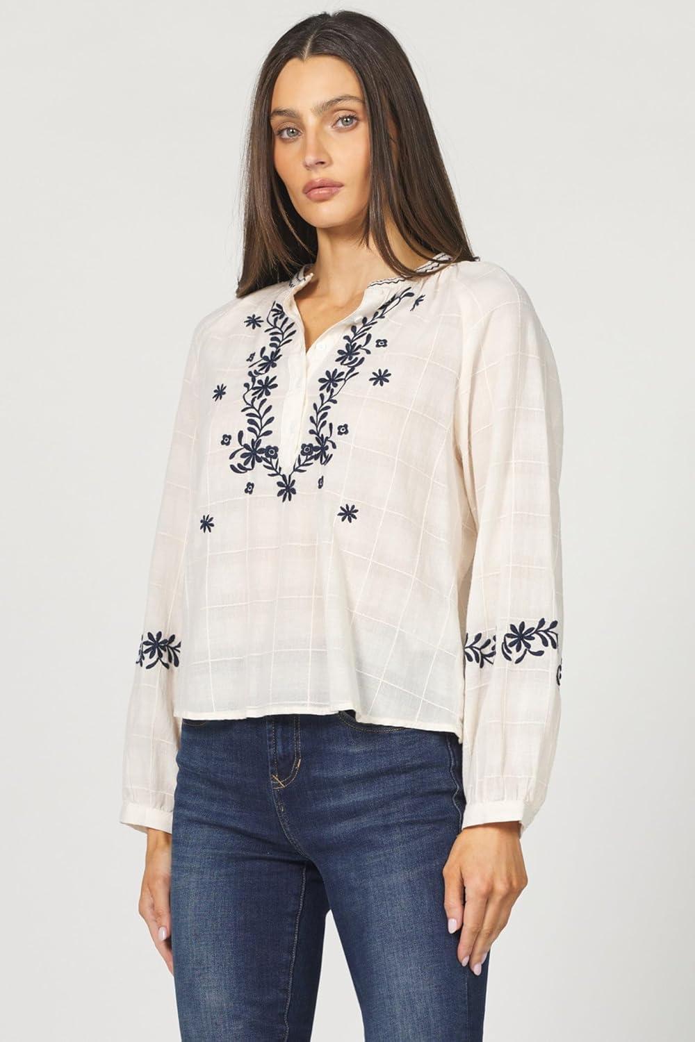 DEAR JOHN Ella Top Long Sleeve Relaxed Fit Embroidered Detail V-Neck Blouse(Whitecap Gray)