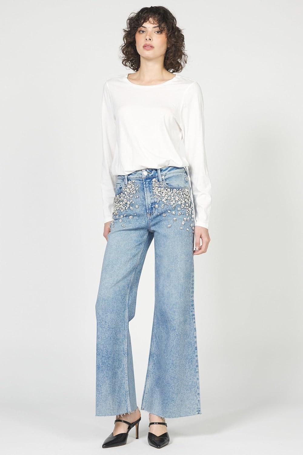 DEAR JOHN Fiona Wide Leg Women’s Jeans High Rise Highwaisted Denim Classic Fit Full Inseam(Sparkle)