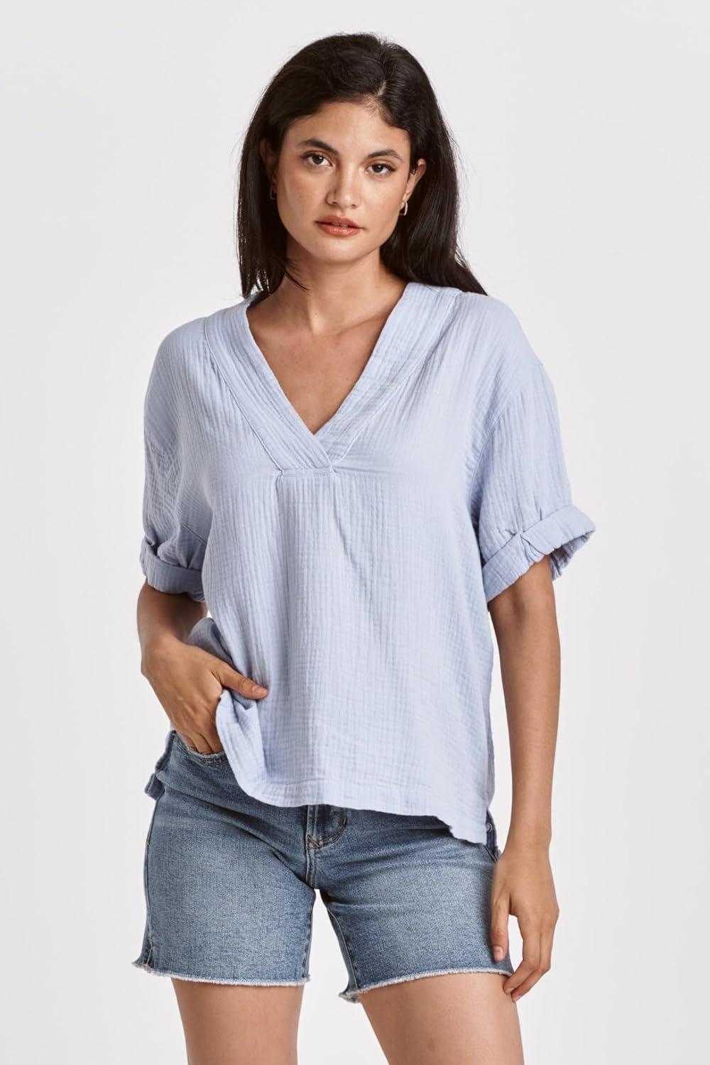 Don’t miss out on our limited-time offer: buy DEAR JOHN Jailee Women’s Top Gauze V-Neck Rolled Short Sleeve(Corn Flower), get {accessory} 50% off!