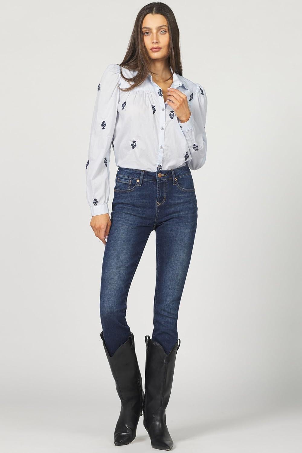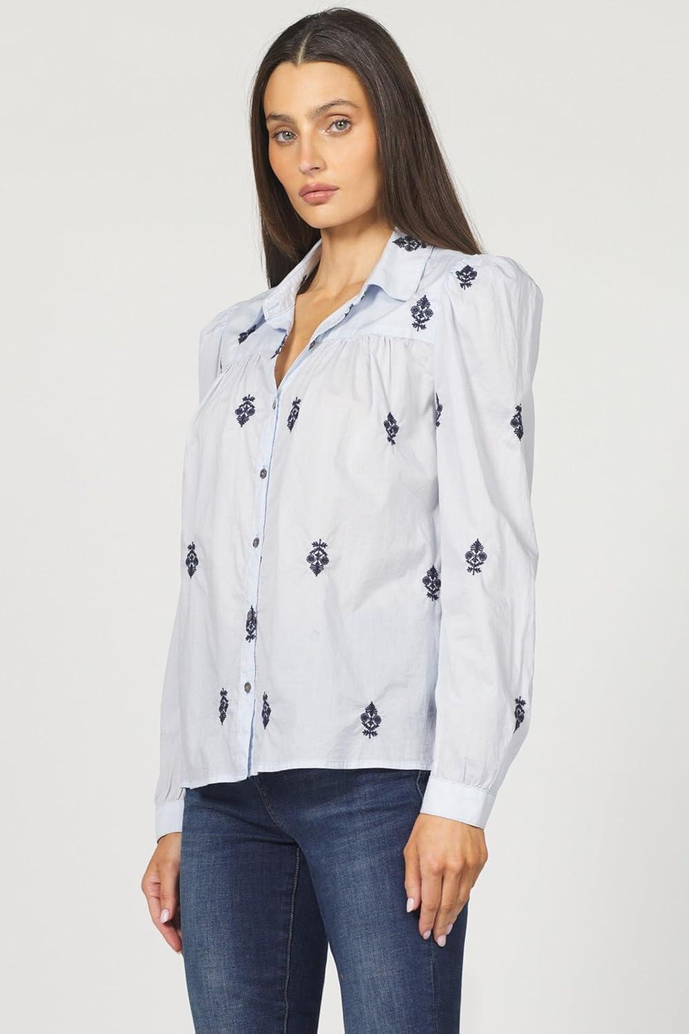 DEAR JOHN Nasrin Shirt Women’s Embroidered Long Sleeve Button-Up Cotton Classic Fit Blouse(Independence Blue)