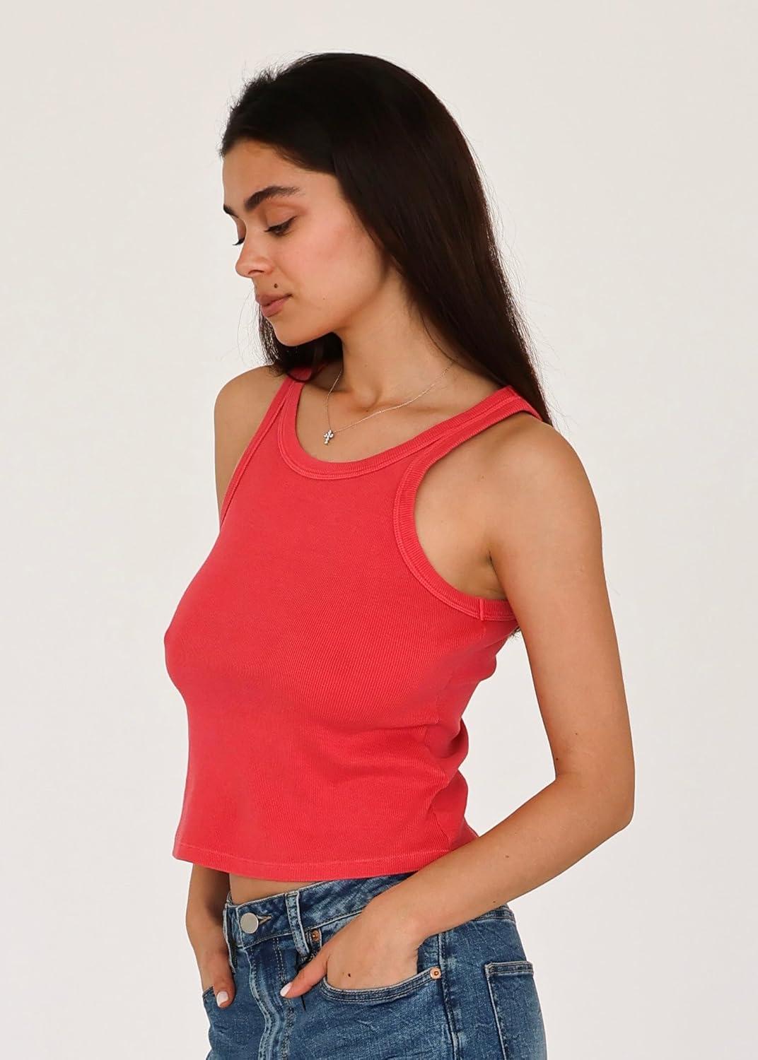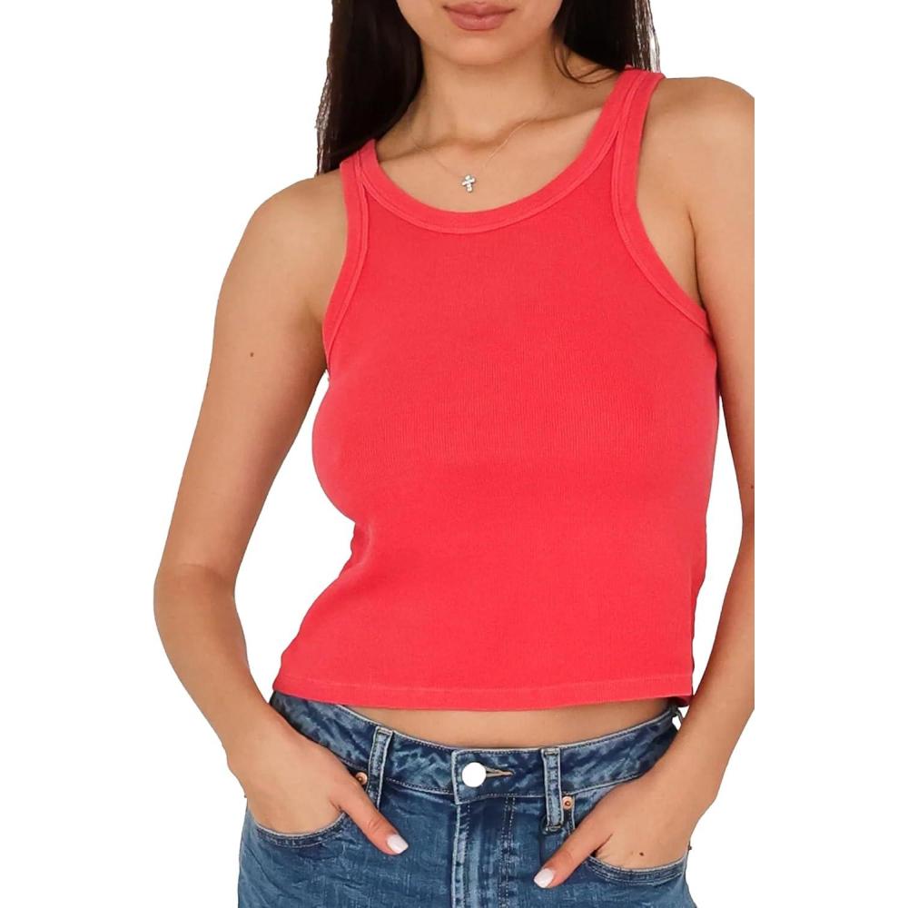DEAR JOHN Tamia Cropped Racer Back Sleeveless Crew Neck Women’s Tank Top Fitted Knit(Radiant Red)